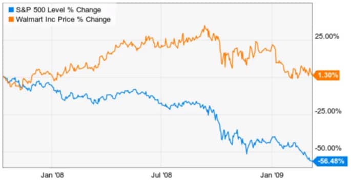 In fact, Walmart held the distinction of being the top performer among the current Dow Jones Industrial Average equities during the Great Recession in 2008.