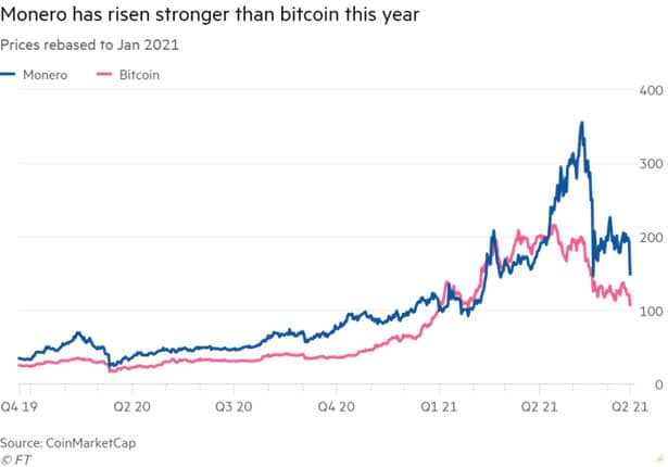 The above graph represents the upward growth trajectory of Monero and Bitcoin from the last quarter of 2019 till the second quarter of 2021.